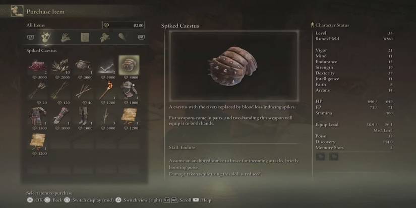 This weapon's starting skill is Endure. While other Ashes of war can also be used, Endure is incredibly helpful as it boosts your poise and lowers damage received. Fist-type builds suffer from being easily hit, and continuing to fight through those hits is ideal.